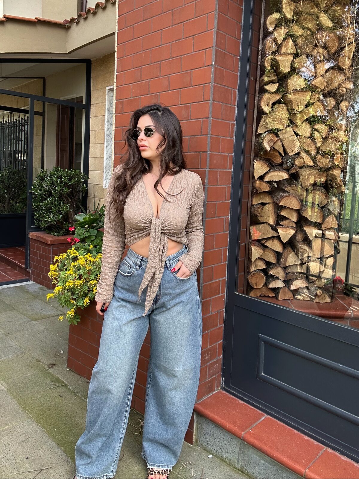 Jeans in denim lavaggio azzurro chiaro leggermente sabbiato, presenta una linea ampia e dritta che scende morbida lungo la gamba.
